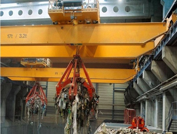 垃圾吊的用途发表时间:2021-06-02 16:59 一、用途 垃圾搬运用半自动控制抓斗起重机是城市生活垃圾焚烧厂垃圾供料系统的核心设备,位于垃圾贮存坑的上方,主要承担垃圾的投料、搬运、搅拌、取物和称量工作。 投料:当焚烧炉进料口的垃圾不足时,起重机抓取垃圾坑中发酵好的垃圾运行至进料口上方,给垃圾焚烧炉的进料漏斗加料。 搬运:将靠近卸料门的垃圾运到贮坑的其他地方,避免卸料门的拥堵,调节坑内垃圾数量,使之贮存3~5天的垃圾焚烧量。 搅拌:由于国内的生活垃圾含水量较高,燃烧值较低,垃圾在贮存坑内需停留一定的时间,通过自然压缩和部分发酵,降低含水量,提高热值。新旧垃圾的搅拌混合可缩短发酵时间。另外,由于生活垃圾的组成复杂,成份含量变化大,为避免进炉垃圾性质波动过大,也需要对坑内垃圾进行必要的搅拌与混合。 取物:将不慎进入贮坑中,但不宜焚烧处理的物体取出。 称量:为了统计垃圾的实际焚烧量,在垃圾投入焚烧炉进料口之前,对投入进料口的垃圾进行称重计量。 由于垃圾抓斗起重机的工作等级较高以及起重机本身的特性,给系统的稳定可靠运行带来了很大的挑战,我公司通过在起重行业的工作积累和总结垃圾抓斗的运行特性,研制出了一套专为垃圾抓斗起重机设计的变频调速控制方法,使起重机能够稳定可靠的运行。 由两台垃圾抓斗起重机组成的起重机搬运系统(一台工作、一台备用),用于完成对垃圾焚烧发电厂的垃圾投料、倒垛、混料、移料和破料等工作。每一台起重机都有自己独立的电气控制系统、操作控制台和HMI显示面板,根据用户的需要可提供手动、半自动的控制系统。手、自动切换方便快捷。
